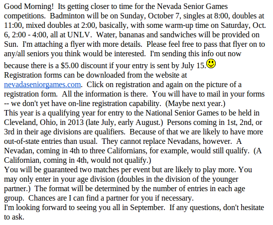 NO BADMINTON AT 2011 SENIOR GAMES :-(